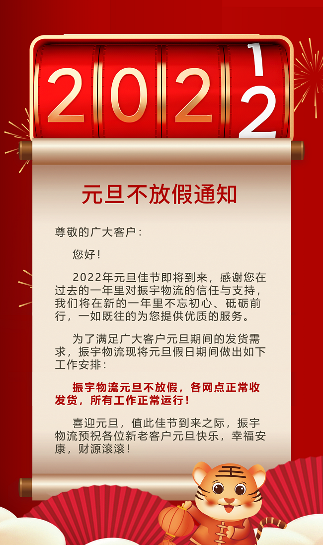 為了滿足廣大客戶元旦期間的發(fā)貨需求,振宇物流現(xiàn)將元旦假日期間做出如下工作安排: