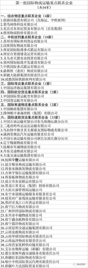 按照運力資源充足、網絡覆蓋健全、運輸組織高效、經營信譽良好的原則,經各有關部門及沿邊省份交通運輸主管部門推薦,確定54家企業作為第一批國際物流運輸重點聯系企業,其中,綜合物流企業4家、中歐班列運營企業10家、國際航運企業1家、國際航空貨運企業2家、國際寄遞物流企業2家、國際道路運輸企業35家。包括招商局集團、菜鳥網絡、京東集團、德邦股份、中遠海運、中國郵政集團、順豐、國貨航等企業入圍。