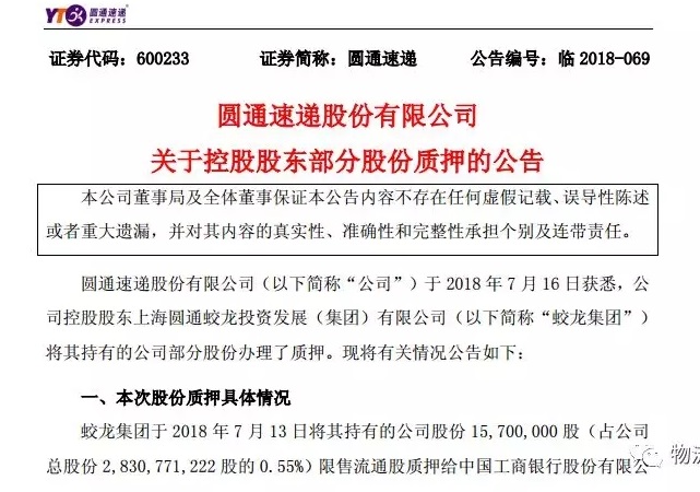 7月17日,圓通速遞發布關于控股股東部分股份質押的公告。公告顯示,公司控股股東上海圓通蛟龍投資發展(集團)有限公司(以下簡稱“蛟龍集團”)將其持有的公司部分股份辦理了質押。