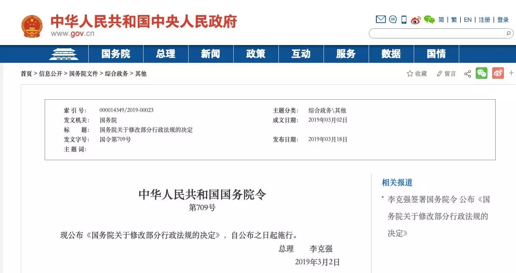 3月18日,國務院總理李克強簽署國務院令,公布《國務院關于修改部分行政法規的決定》(以下簡稱《決定》),自公布之日起施行。《決定》顯示,經過清理,國務院此次共對49部行政法規的部分條款予以修改。其中,與快遞、物流、交通運輸業息息相關的《快遞暫行條例》和《中華人民共和國道路運輸條例》等多項條款被修改。