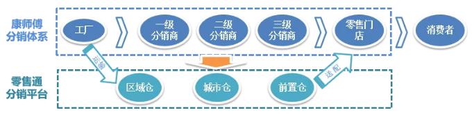 因此雙方在2018年11月達(dá)成了整體合作,康師傅將借助阿里零售通平臺(tái),推進(jìn)門店數(shù)字化、供應(yīng)鏈數(shù)字化、營(yíng)銷數(shù)字化和決策數(shù)字化等在內(nèi)的一系列升級(jí)優(yōu)化,構(gòu)建智能分銷網(wǎng)絡(luò),為傳統(tǒng)線下銷售渠道接入“中央處理器”。具體做法是康師傅將組織全國(guó)分銷網(wǎng)絡(luò)的客戶加入零售通平臺(tái),分銷商向工廠下單、夫妻老婆店向分銷商下單均使用零售通的線上電商平臺(tái),貨物視情況入到菜鳥系的倉(cāng)庫(kù),收到訂單后借助區(qū)域倉(cāng)、城市倉(cāng)、前置倉(cāng)等不同類型的倉(cāng)庫(kù),以較短時(shí)效送達(dá)門店店主手里。康師傅的商流、信息流、物流、資金流在阿里零售通體系中流轉(zhuǎn),物流鏈路變短,中轉(zhuǎn)裝卸次數(shù)變少,周轉(zhuǎn)效率更高。